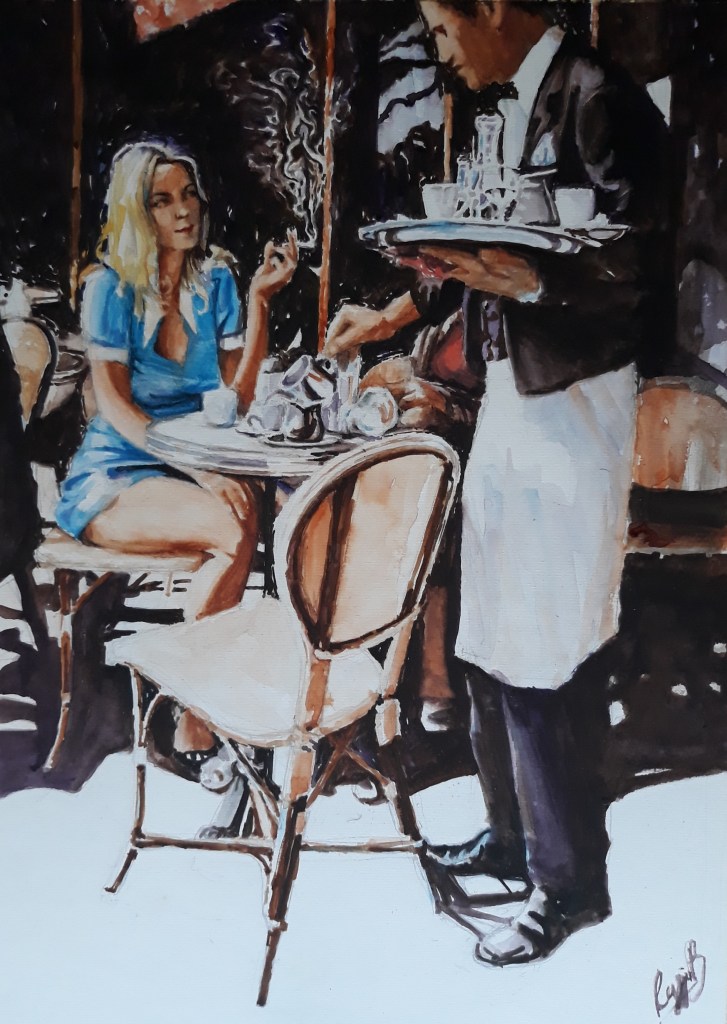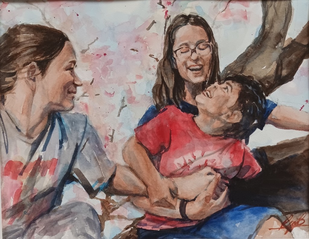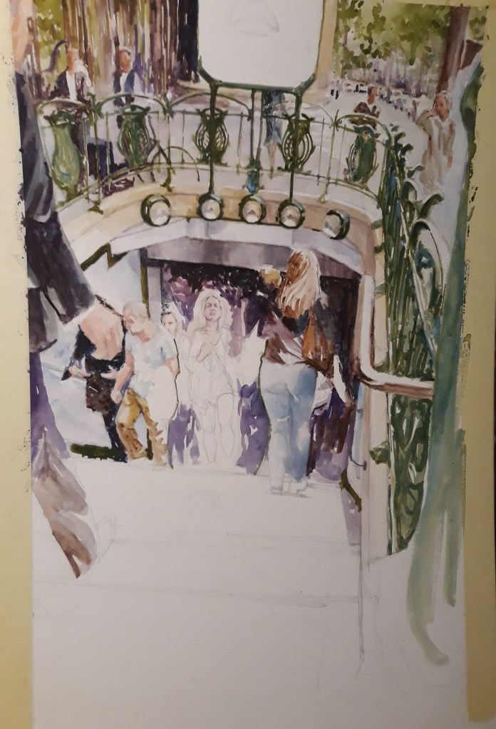 I take a few photos of a moment and place that inspire me. I’ll use them to compile a pencil sketch that captures the movement and the senses I felt. I then add layer after layer of color until I live the moment again.